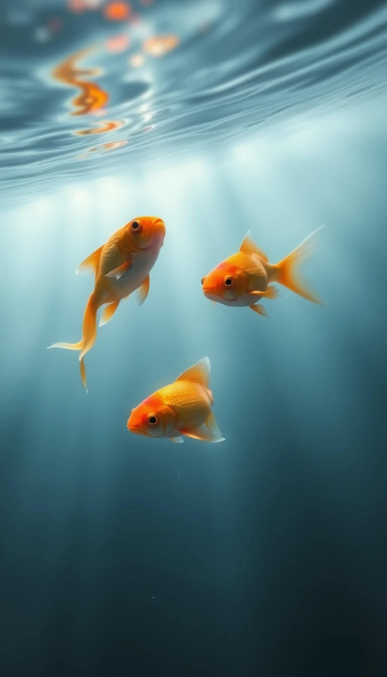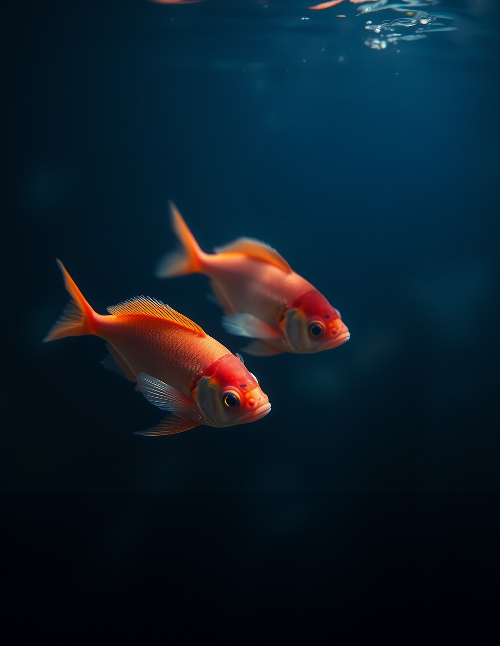 "primary_objective": "Generate a hyper-realistic underwater photograph of two ornamental goldfish suspended in dark deep water, lit dramatically from above with volumetric light rays."