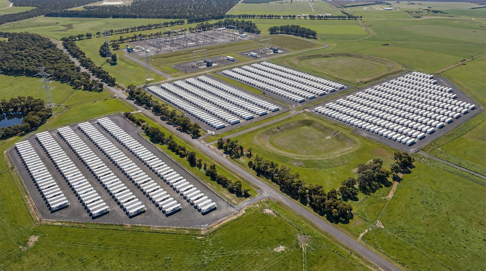 "color_palette": "High contrast between the clinical white of the BESS units, the dark tarmac, the textured grey gravel, and the intense, vibrant tropical greens of the surrounding landscape."