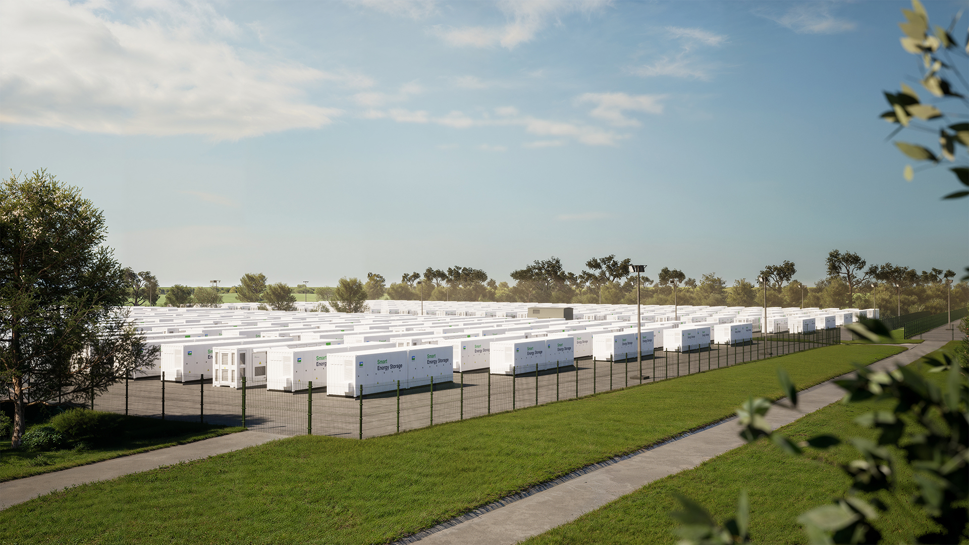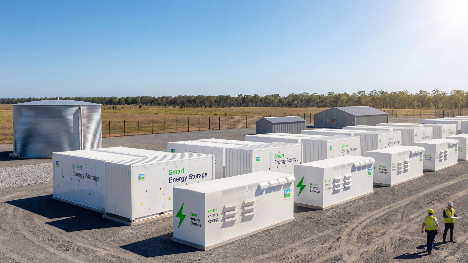 "appearance": "Factory-fresh, highly polished white BESS units. Maintain the existing 'Smart Energy Storage' text and green/blue lightning logos exactly as currently placed.",