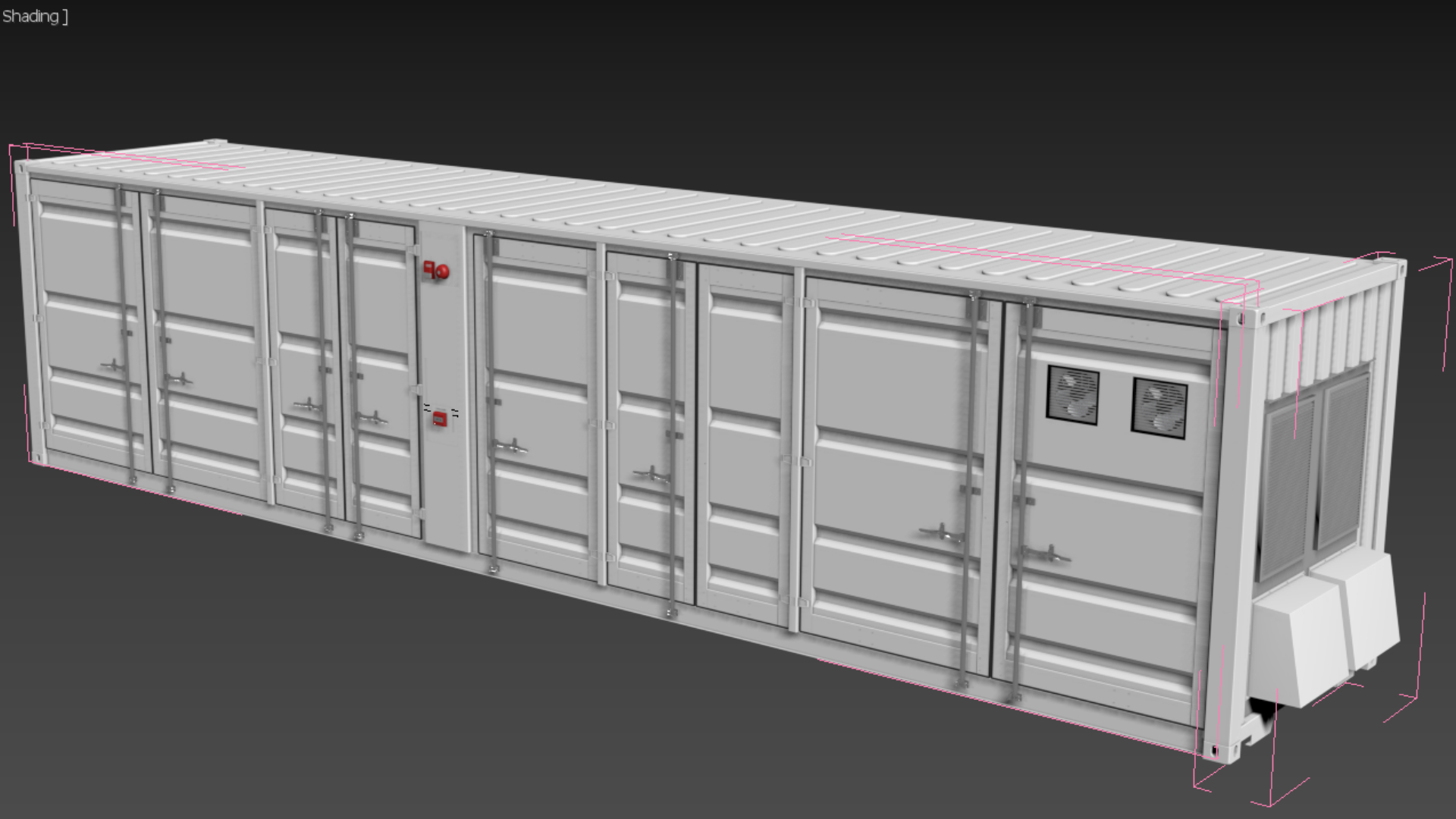 "batteries": "White industrial containers. Apply matte powder-coated metal texture with realistic panel seams and self-shadowing.",