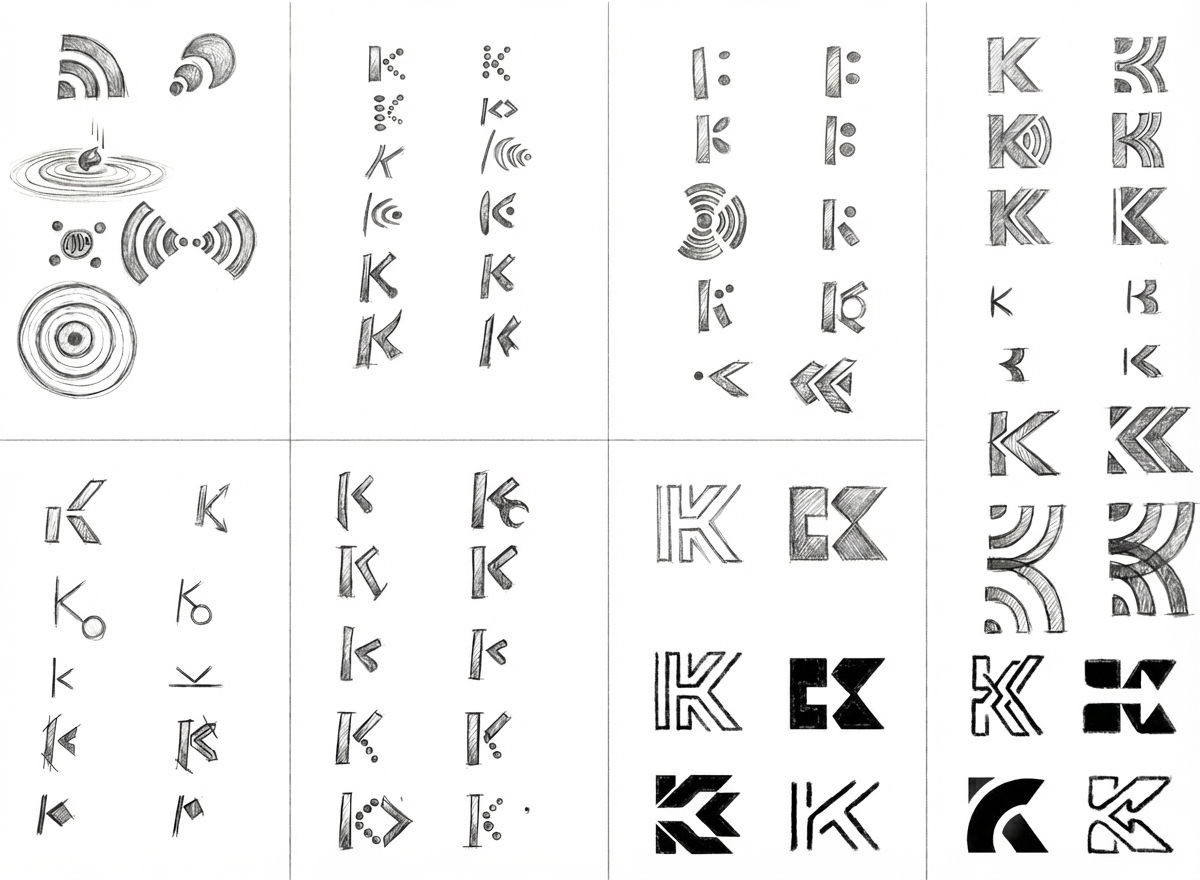 With the name locked, I focused on making the least memorable letter — the 'K' — into the most recognisable element of the brand. Early sketches explored sound wave motifs, negative space, and geometric forms that could sit cleanly on a sensor casing at 12mm or a trade show banner at 12 metres.