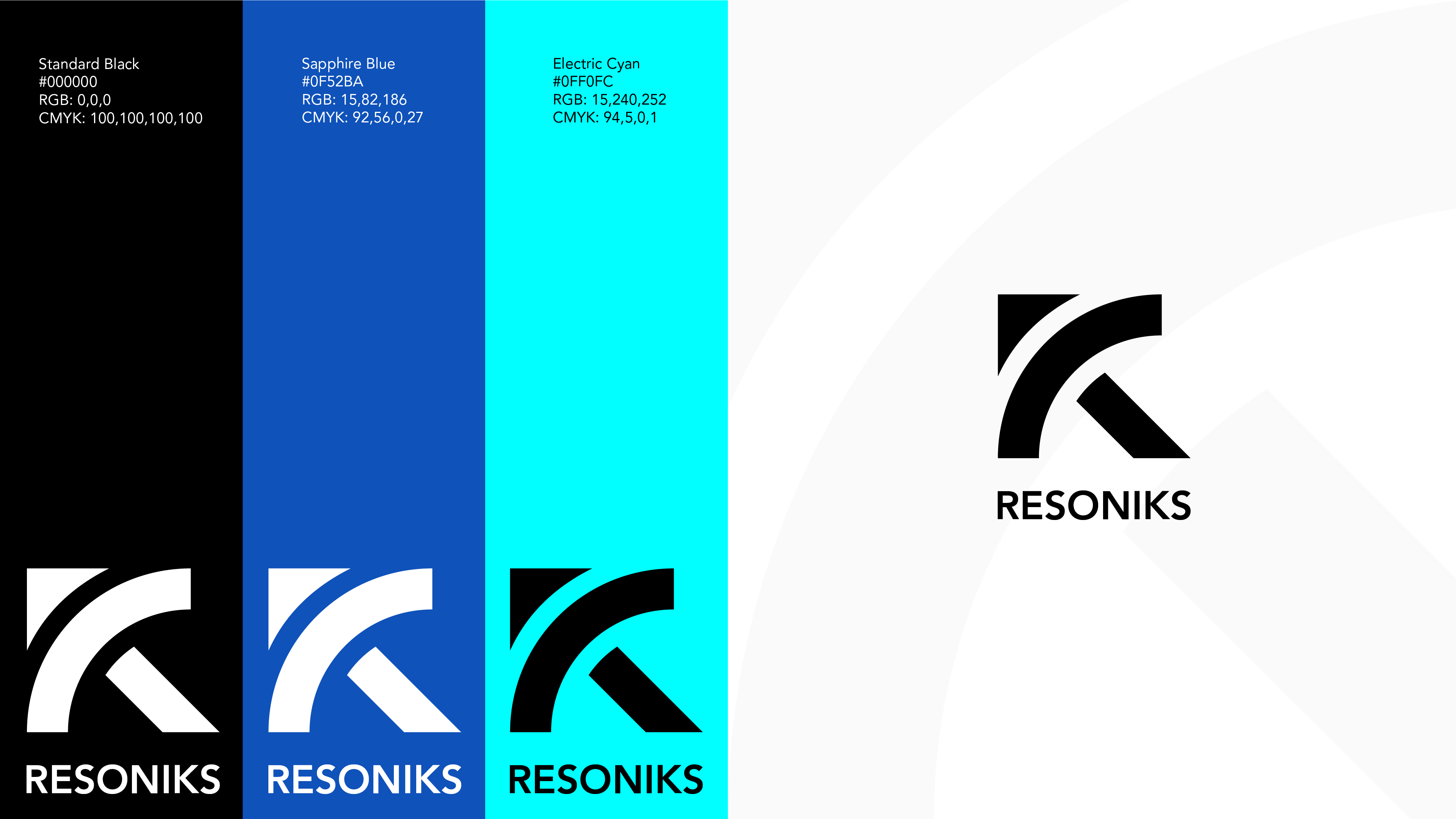The finished logo distils everything — acoustic waves, precision engineering, and forward momentum — into a single, scalable mark. Paired with a refined colour palette and type system, Resoniks now has a brand identity that matches the sophistication of its technology and stands apart in the industrial AI space.