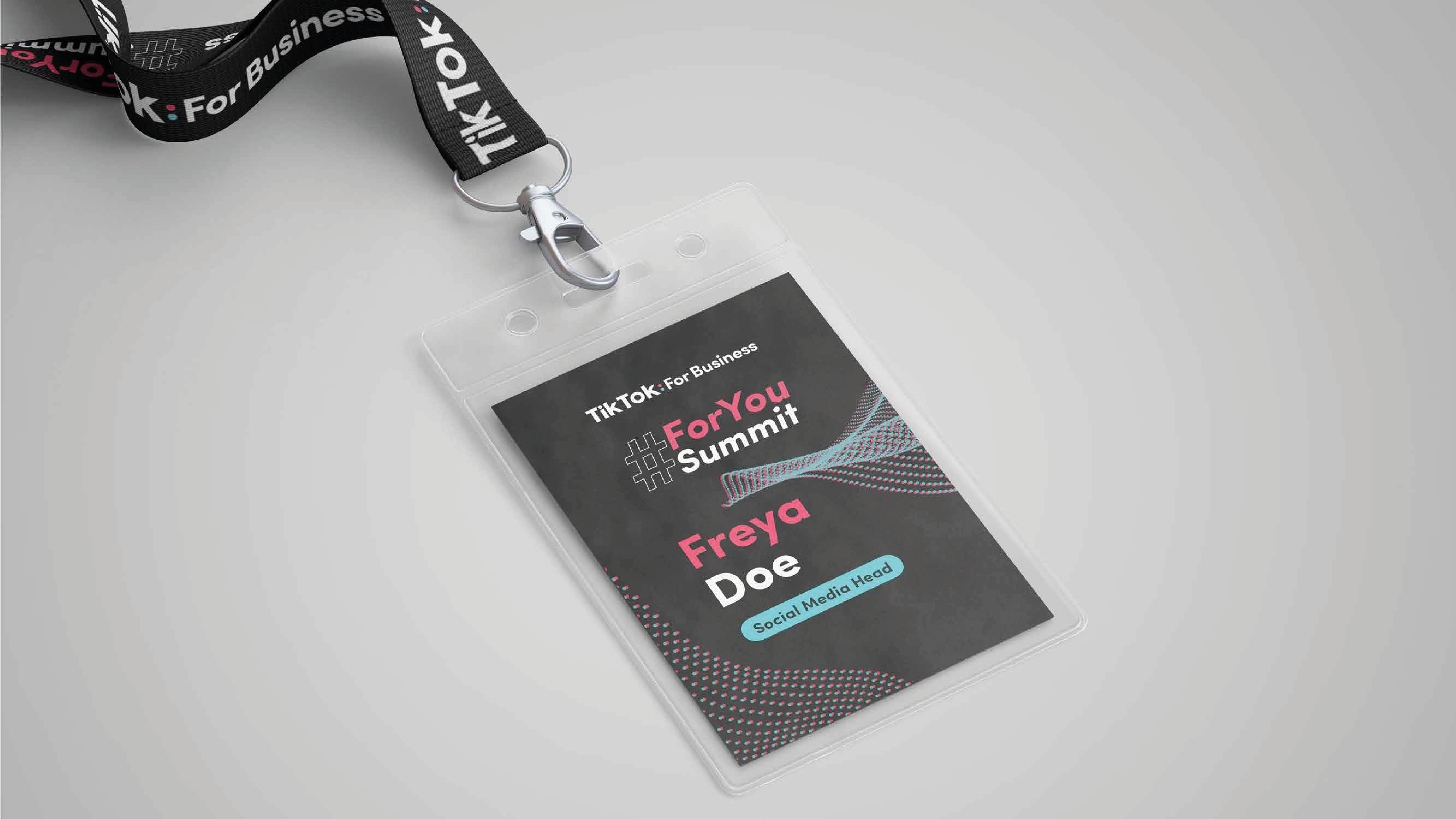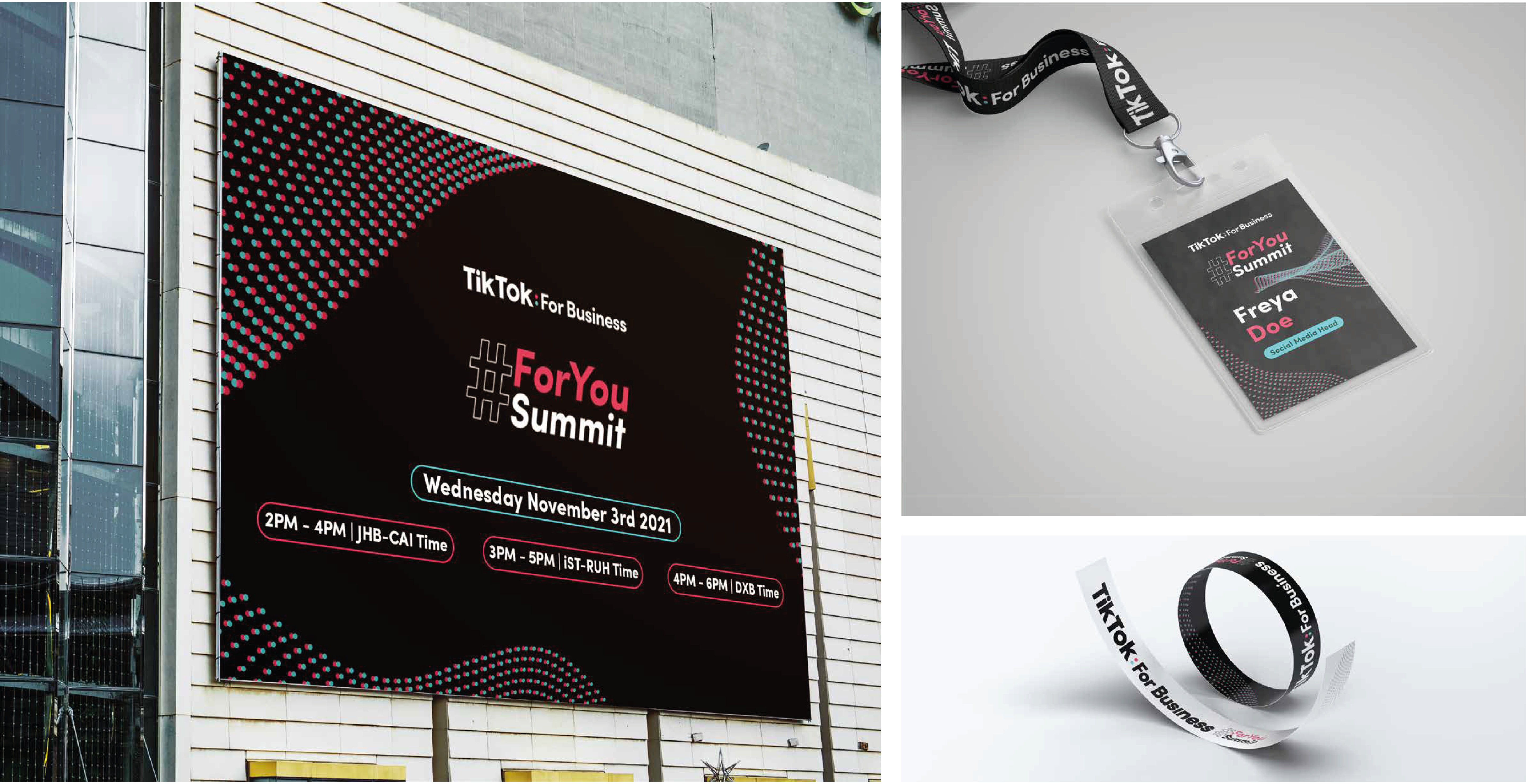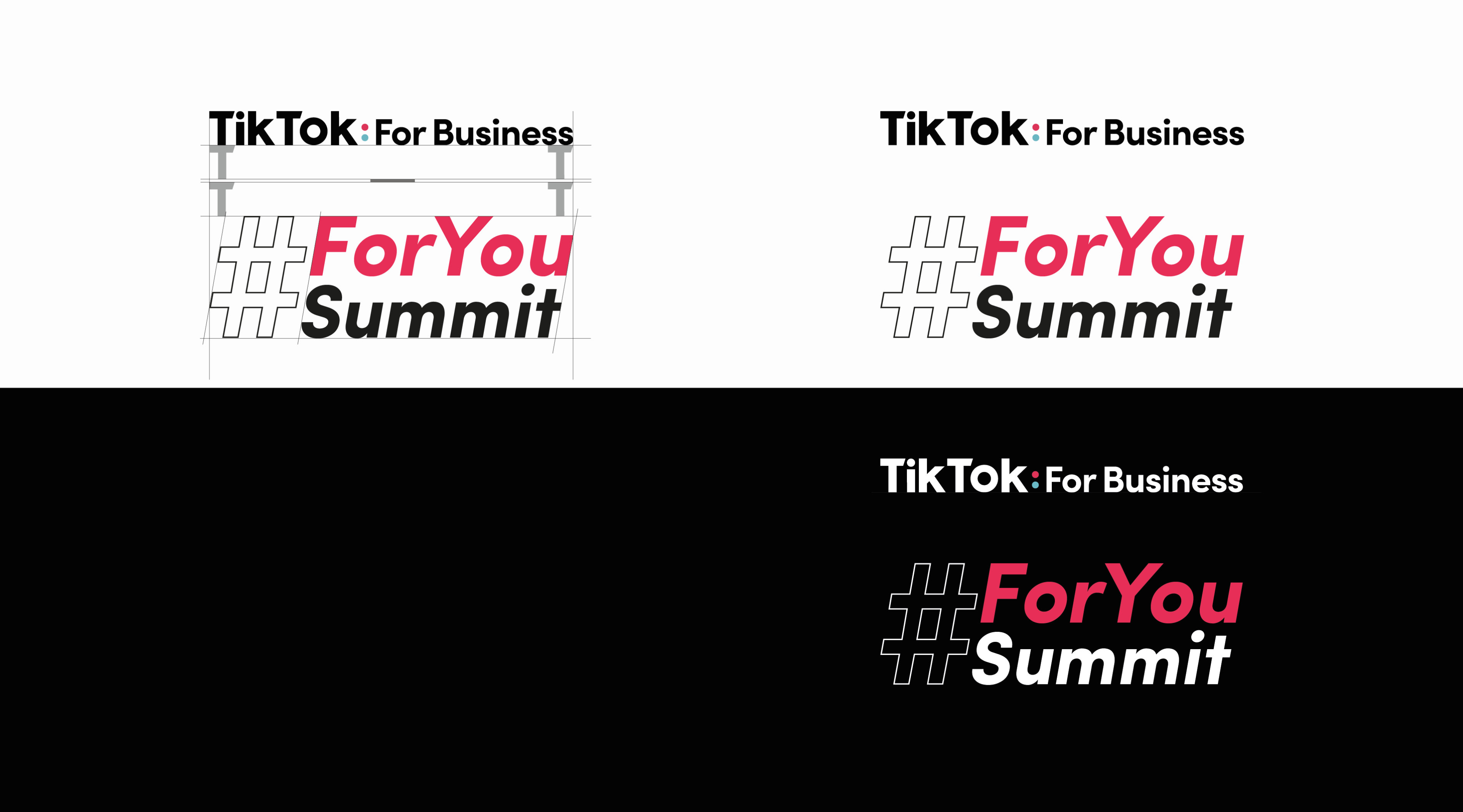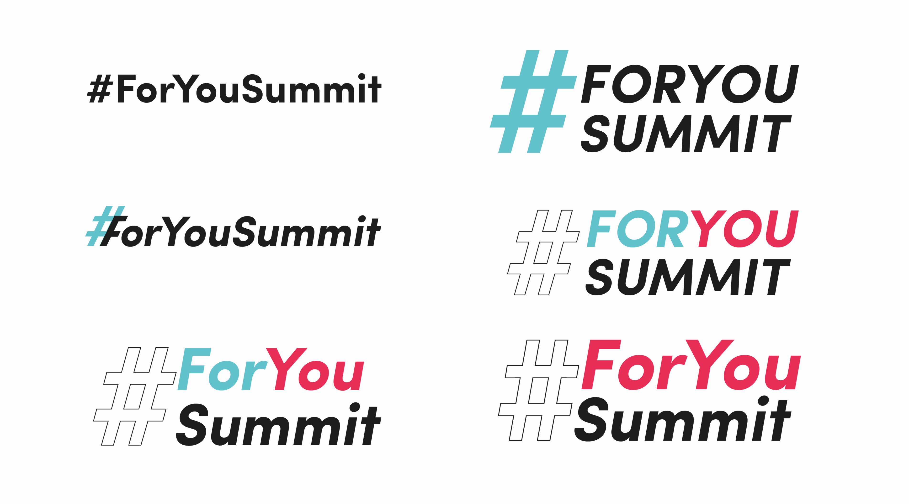 I started with the simple form first and went on to explore the possibilities with the Hashtag. After quite a few iterations I realised that the splash blue won't be a good choice for the type — it drives too much attention on a black background and isn't legible on white. I landed on an italic lockup as it suits the theme of 'dynamic', and the razzmatazz puts the focus on 'For You' which is the key element of TikTok and the event.